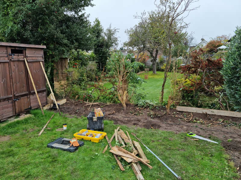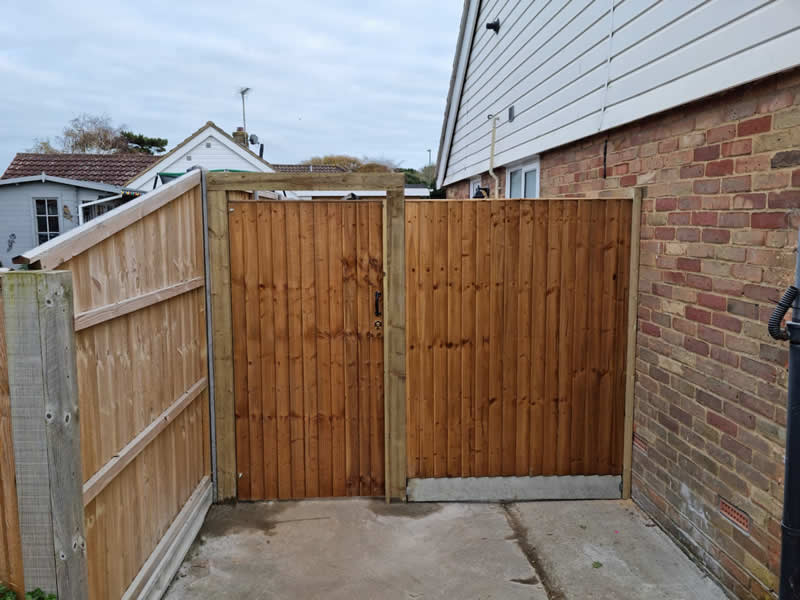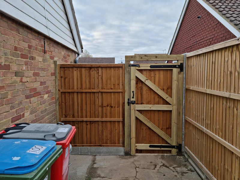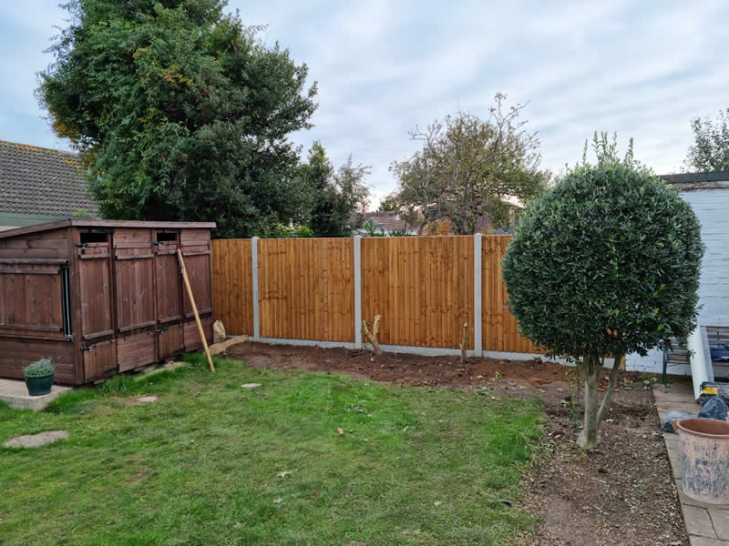 Here we removed the old perimeter fencing and replaced it with 5ft closeboard panels, using 7ft concrete slotted posts and 6" concrete gravel boards. We also replaced the side gate with our manufactured timber gate.